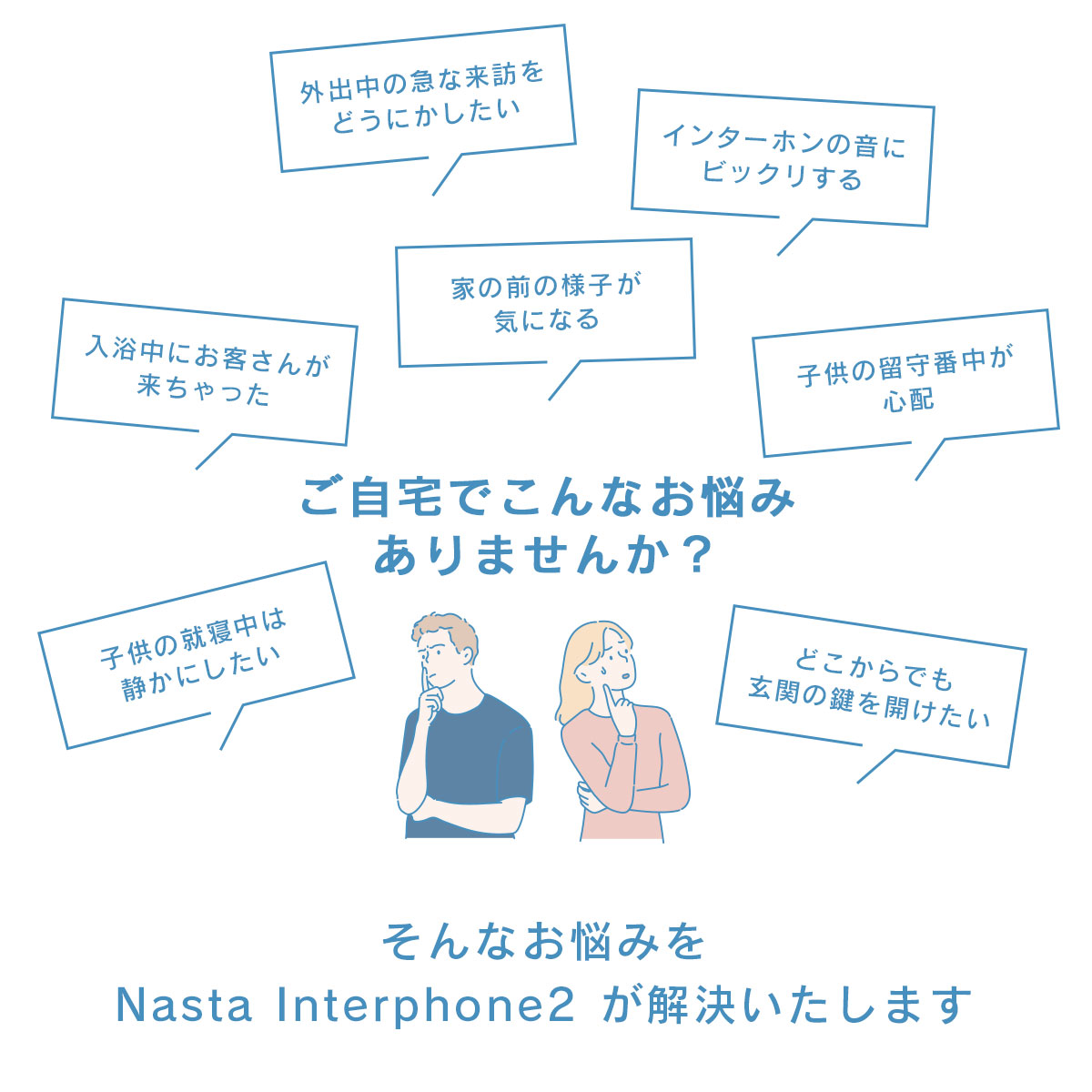 ご自宅でこんなお悩みありませんか?「外出中の急な来訪に対応したい」「インターホンの音にビックリする」「入浴中にお客さんが来ちゃった」「子供の留守番中が心配」「家の前の様子が気になる」「子供の就寝中は静かにしたい」「どこからでも玄関の鍵を開けたい」「」