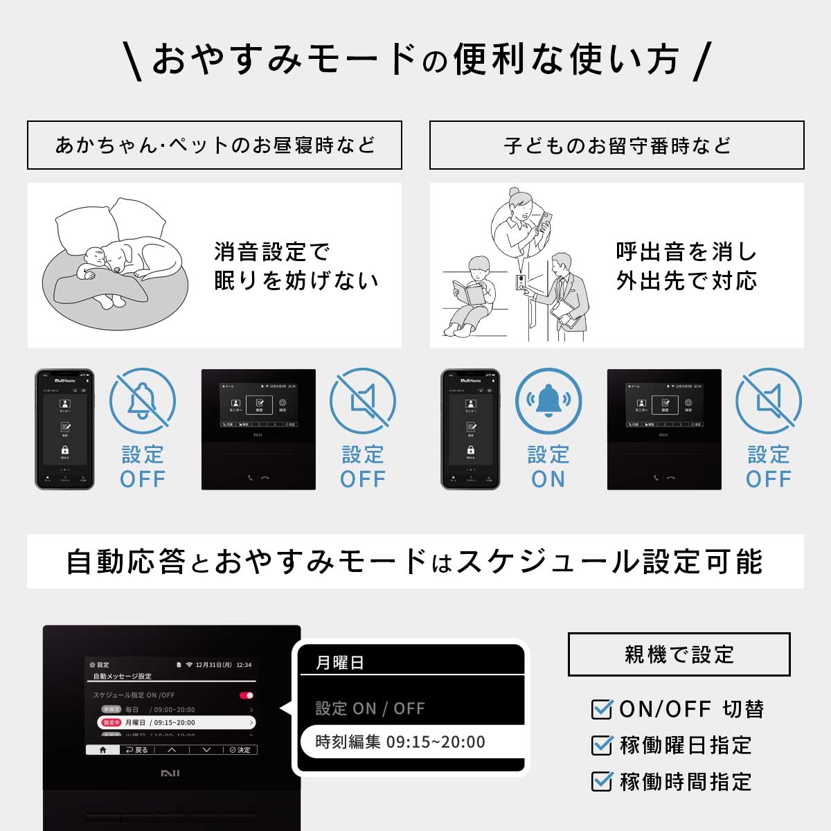おやすみモードの便利な使い方。「あかちゃん・ペットのお昼寝時などの場合」スマホは通知OFF、親機は消音設定にします。「子供のお留守番などの場合」スマホは通知ON、親機は消音設定にします。また、自動応答とおやすみモードはスケジュール設定が可能です。