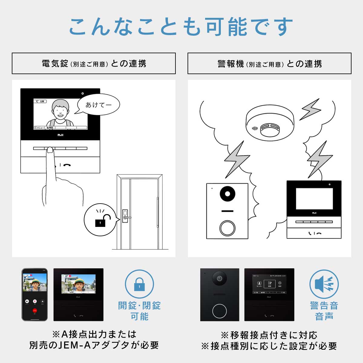 ※電気錠、火災警報器または住宅用火災移報アダプタ、ガス警報器をご使用になるには、機器の種類や接点種別に応じた設定が必要です。