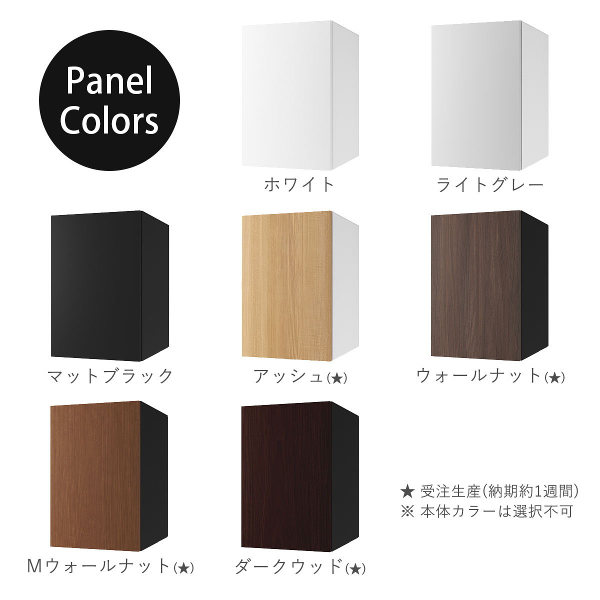 ホワイト、ライトグレー、マットブラックと扉オープン時のイメージ画像。