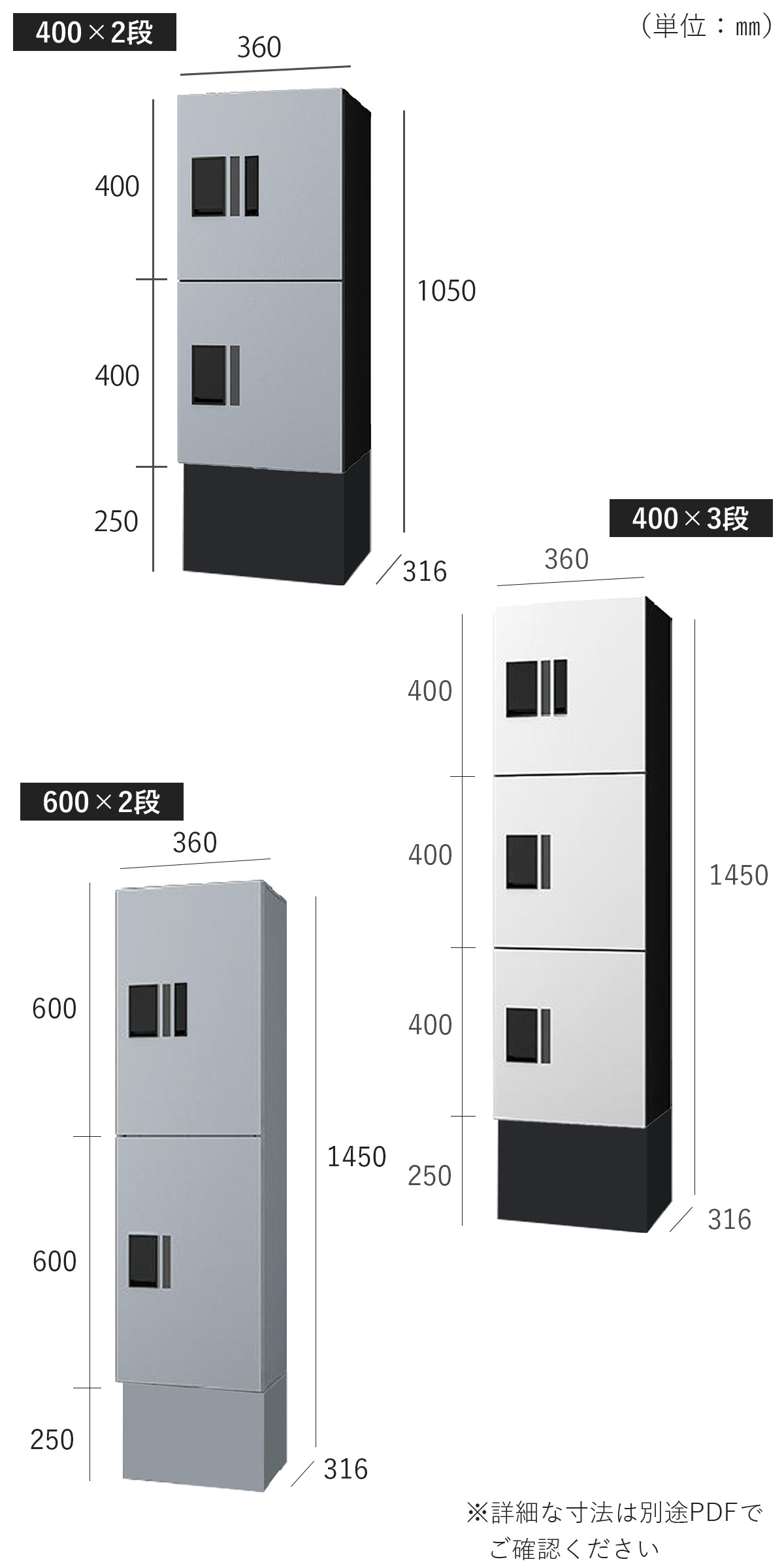 宅配ボックスの合計個数:(400×2段)2個、(400×3段)3個、(600×2段)2個